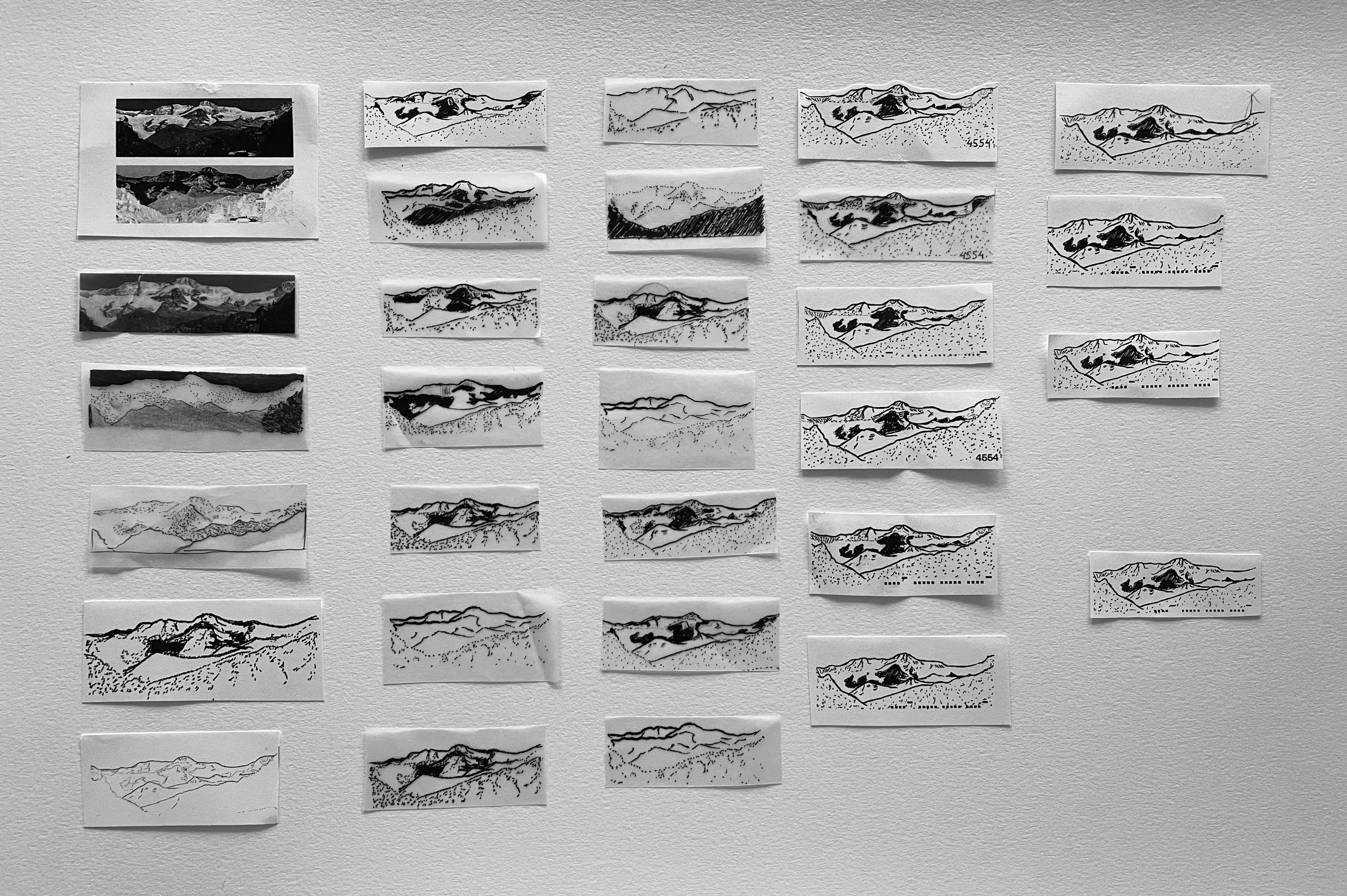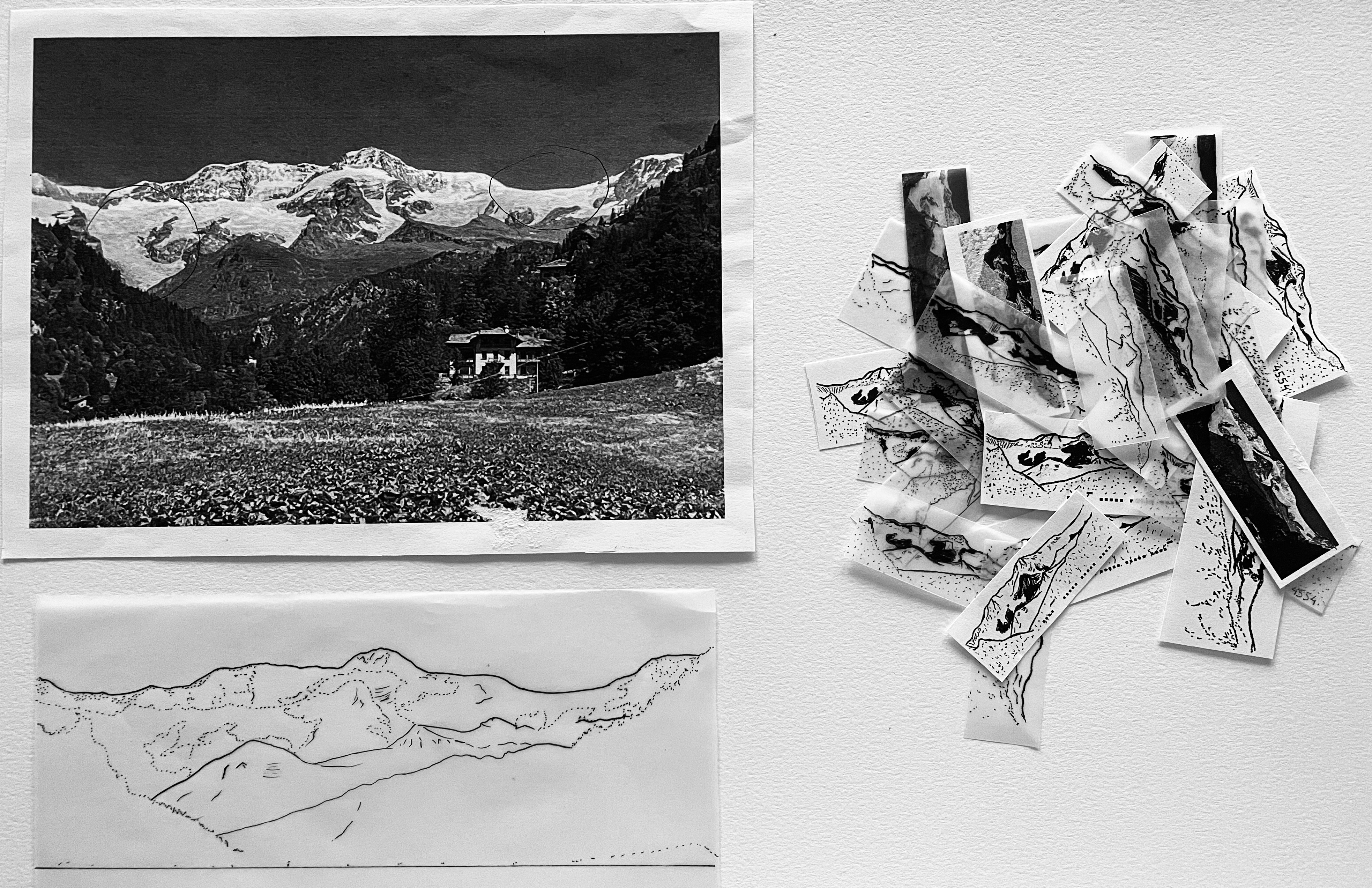 A: I sent a photo of the mountain to you and then we worked together on the drawing, deciding on black and white, the shadows and what to put and what to take off because of the aesthetic or because it had a meaning. It felt very collaborative, responding to each other.